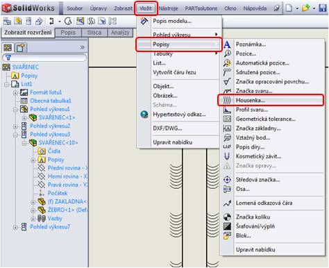3. Pokud chcete vložit svarovou housenku = zadejte " Vložit -> Popisy -> Housenka ".
